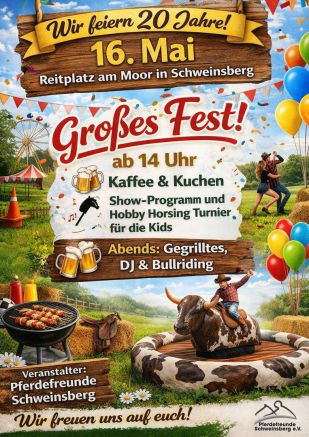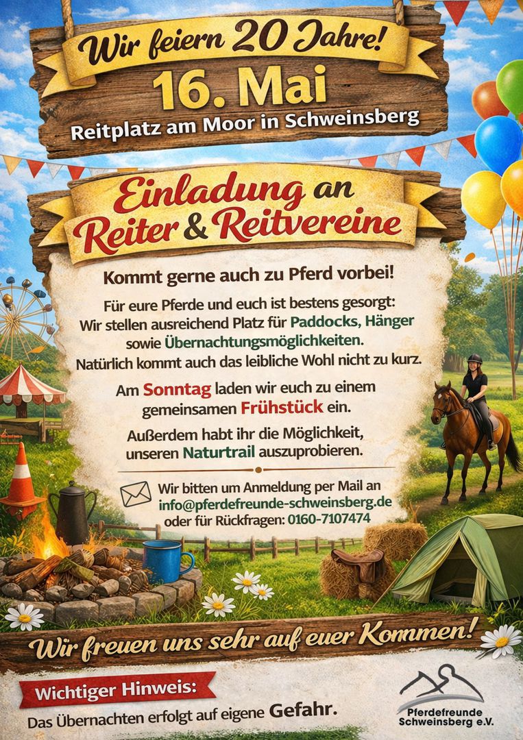 20 Jahre sind seitdem vergangen, weshalb die Pferdefreunde Schweinsberg e.V. dich/euch recht herzlich einladen möchten mitzufeiern.